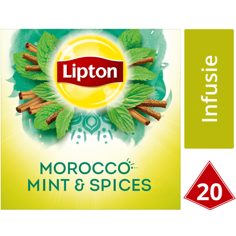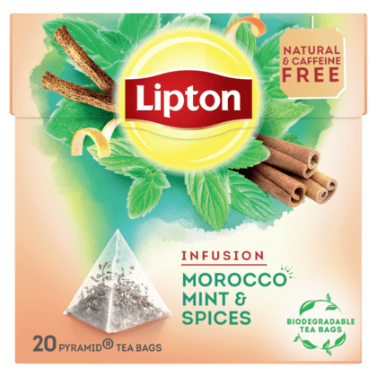 Lipton Morocco is a mystical herbal tea with the charm of Morocco. Full of flavours, smells and colours. The recipe combines long mint leaves with delicate spices like cinnamon and orange peel. Content: 20 tea bags in pyramid shape.